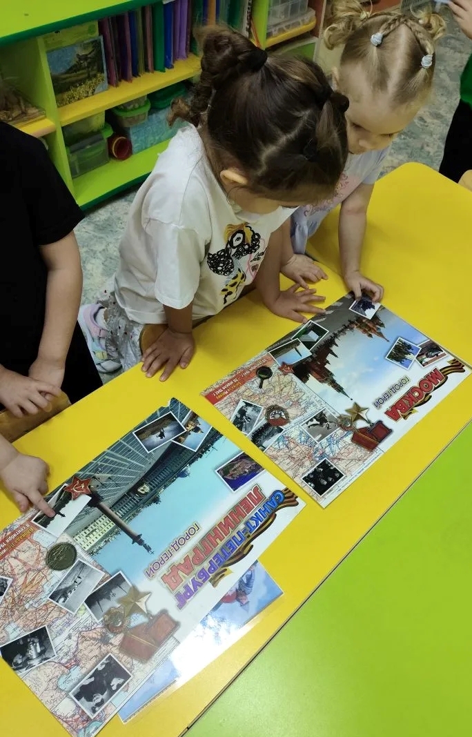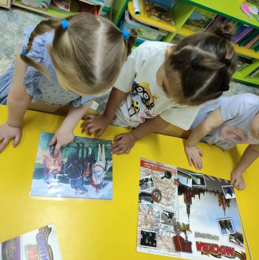 В ходе тематических бесед дошкольники узнали о Героях Отечества, различных наградах и подвигах, как прошлых, так и современных. Педагоги прочитали детям стихи «Вечный огонь» Ю. Шмидта и «Солдаты» С. Востокова, повестей Осеевой "Сын полка" и Георгиевской "Галина мама". а также народную сказку «Каша из топора». Ребята с интересом рассматривали иллюстрации в книгах и альбомах, картины "Богатыри".